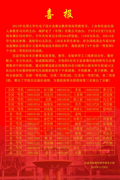 2013年全国大学生电子设计竞赛由教育部高等教育司、工业和信息化部人事教育司共同主办,瑞萨电子(中国)有限公司协办,于9月4日至7日在全国各赛区同时举行。今年共有来自全国1044所院校、11838支队伍、35514名学生报名参赛,我校有42支队伍,126名本科生参加。经全国组委会专家对参加复测队伍的设计方案和现场技术指标评审,我校获得了9个全国一等奖和5个全国二等奖的优异成绩。