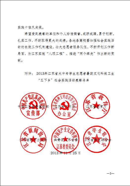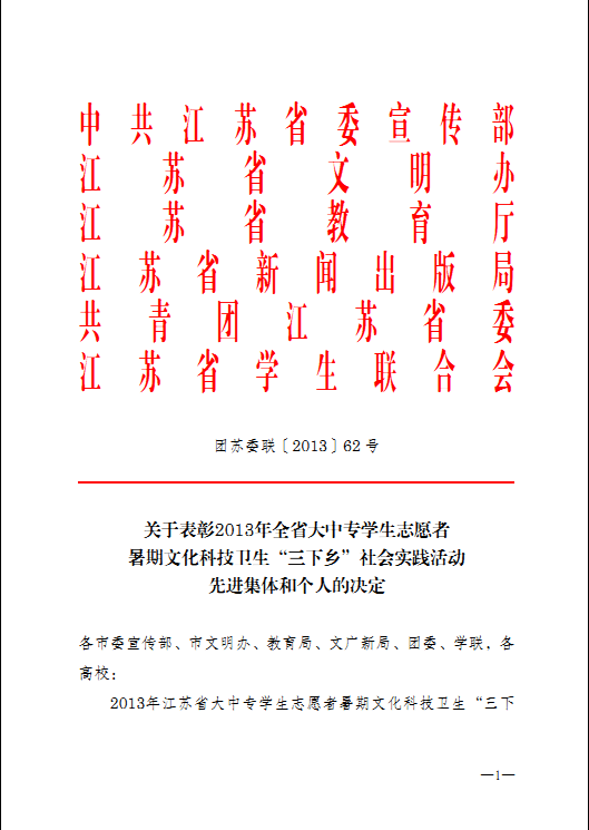 关于表彰2013年全省大中专学校志愿者暑期文化科技卫生“三下乡”社会实践活动先进集体和个人的决定