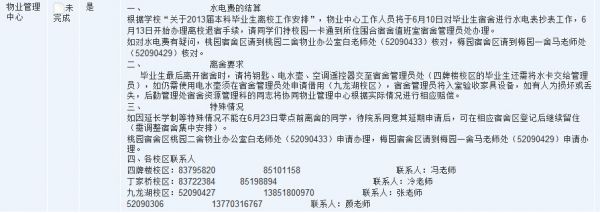 2、物业管理中心:显示是否有水电费欠费状态及是否退宿,请带上一卡通至宿管阿姨处办理。