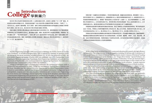 哈尔滨工程大学入选首批“211”计划,是设有研究生院的全国重点大学。其信息与通信工程学院重点服务于国防、船舶、航空航天和工业信息化等领域的教学与科研工作,专任教师122人,各类在校学生2000余人。是国内本学科领域科研和人才培养的重要基地。