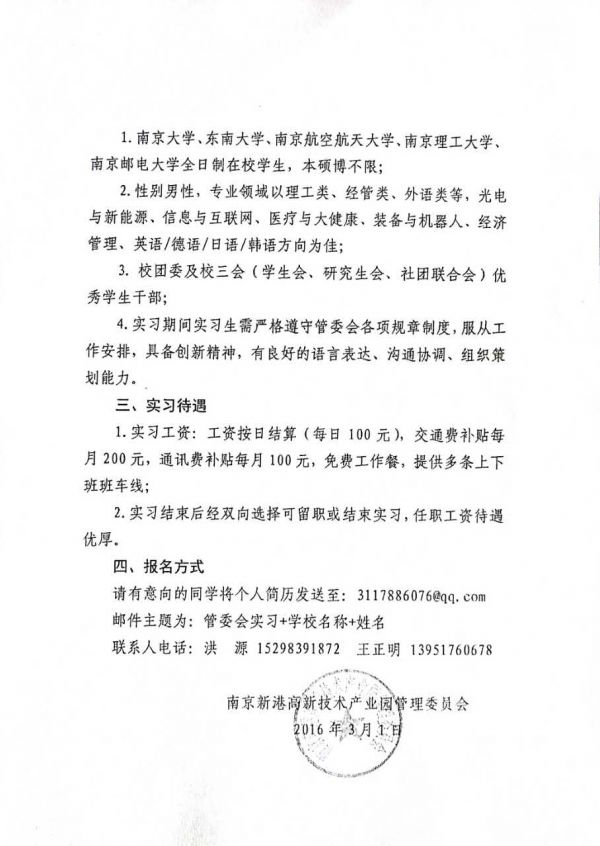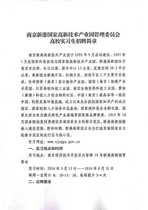 【招聘信息】南京新港国家高新技术产业园管理委员会高校实习生招聘简章