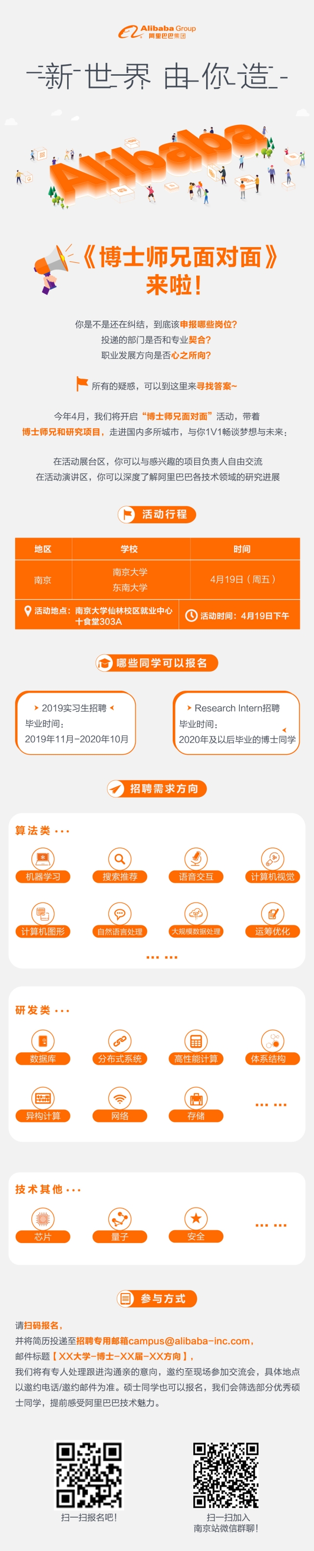 请扫码报名,并将简历投递至招聘专用邮箱campus@alibaba-inc.com,邮件标题【XX大学-博士-XX届-XX方向】,我们将有专人处理跟进沟通亲的意向,邀约至现场参加交流会,具体地点以邀约电话/邀约邮件为准。硕士同学也可以报名,我们会筛选部分优秀硕士同学,提前感受阿里巴巴技术魅力。