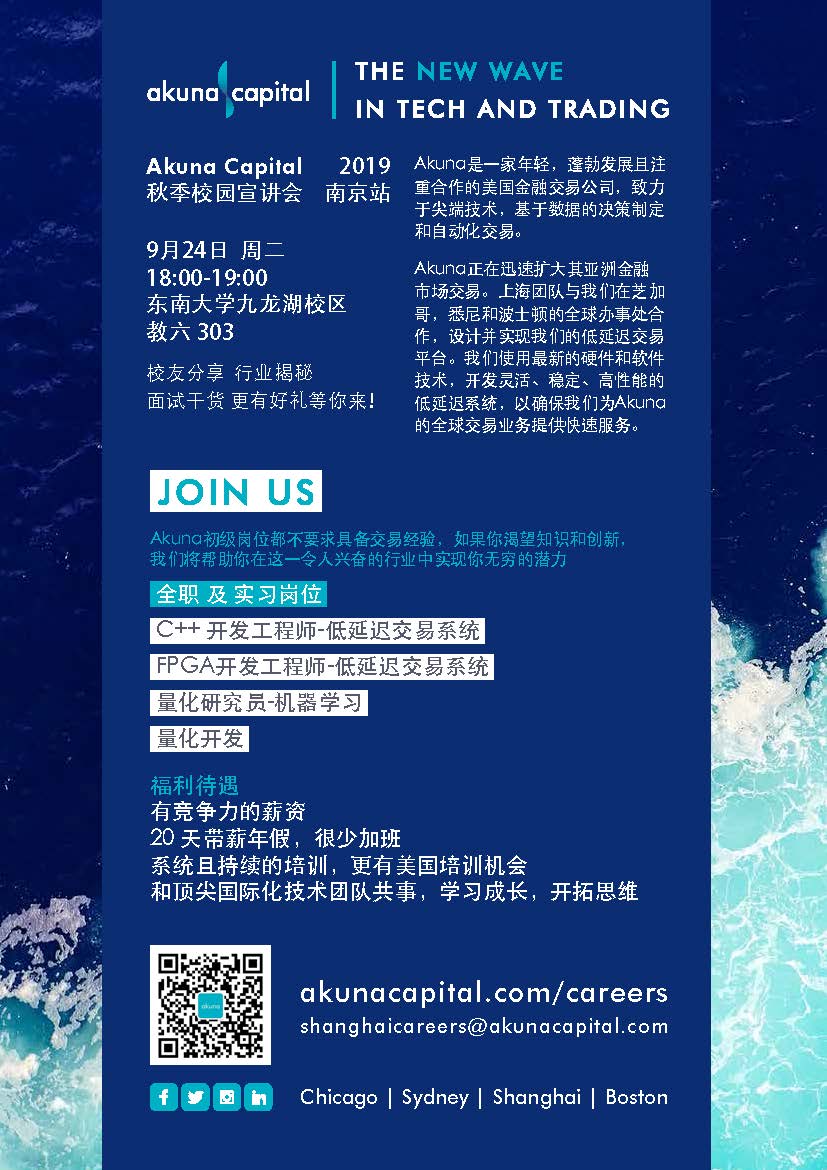 Akuna Capital成立于2011年,总部位于芝加哥。八年来,Akuna已经快速成长为美国顶尖的金融自营交易公司,并逐步向全世界扩张。目前在上海,悉尼,波士顿设有分部,全球有330多人。交易的金融产品包括期权,期货,加密数字货币等。我们专注于前沿技术、数据驱动决策和自动化交易,运用自有资金,自主设计研发低延迟高性能交易系统,研发交易策略,构建量化数学模型,为金融交易提供有竞争力的报价。